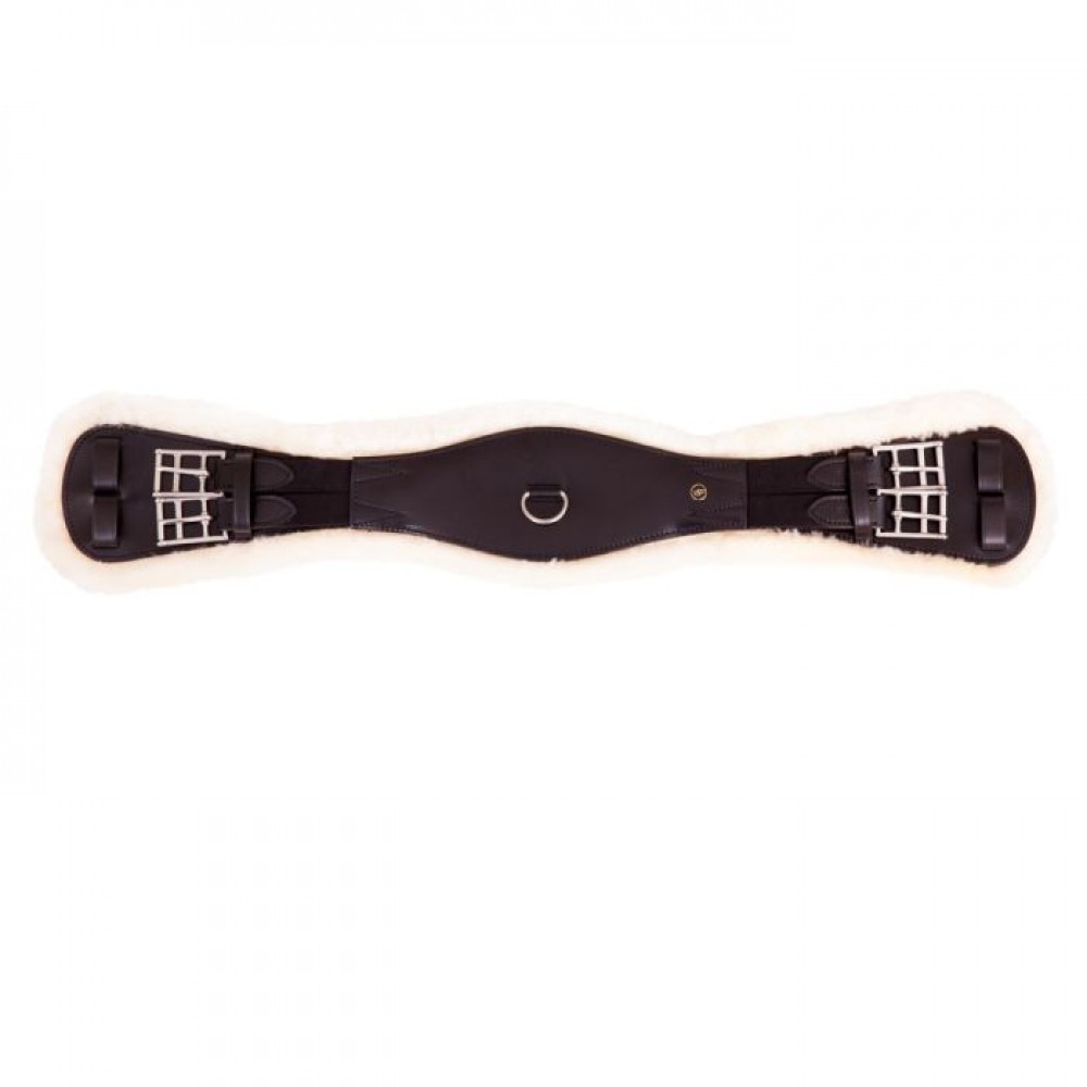 Leather, anatomically shaped dressage girth lined with soft medical sheepskin. This comfortable lining distributes and reduces the pressure of the girth and in addition, it prevents pressure sores and excessive heat accumulation. Medically tanned sheepskins are hygienic, sweat resistant and they are not a culture medium for bacteria. Especially suitable for horses with sensitive skin. The lining is fully detachable by means of Velcro and can be washed at 30°C. The girth features elastic inserts at both ends and a centre D-ring for the possible attachment of draw reins. The anatomic shape of the girth gives the horse maximum freedom of movement. The elastic inserts offer extra comfort and this makes it easier to girth your horse. They also ensure that the saddle will be held in place and in the correct position. The girth has stainless steel roller buckles, which makes girthing easier. The leather girth loops ensure that the girth stays perfectly in place. To preserve the natural properties of the sheepskin, we recommend washing the product at 30°C using a special leather detergent.