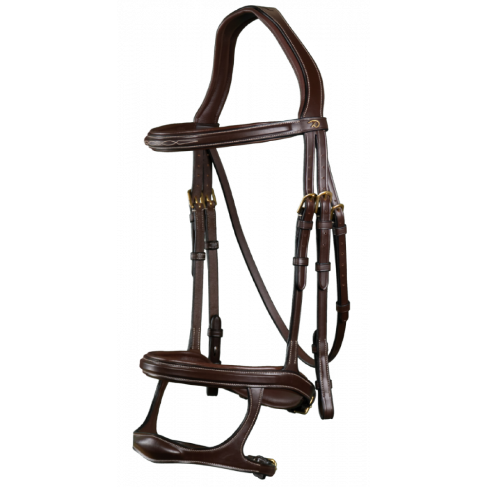 The Dyon Bridle double noseband has decorative stitching and is made of soft and supple leather. The bridle has a double noseband.
