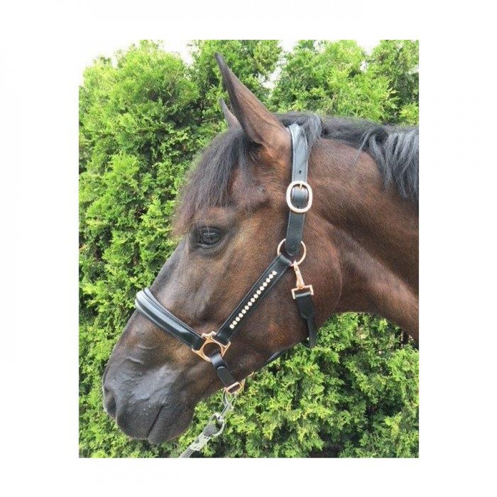 Luxurious leather halter from the HB Showtime collection with Rose gold haberdashery and Rose gold stones on the buckles of the halter. Double adjustable headpiece and noseband with musketon on the back. Soft padding on headpiece and noseband.