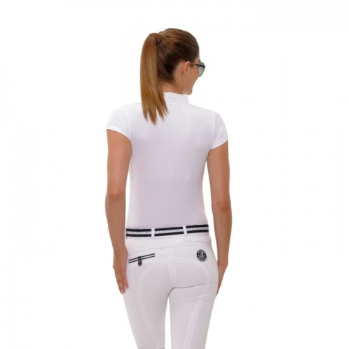 Feminine fitted show shirt with ruffles along the button tape and glittering SPOOKS writing on the collar. High wearing comfort due to stretch content. Slightly longer cut, so it stays in the riding breeches. The show shirt offers a high breathability, because it is provided under the arms with mesh.